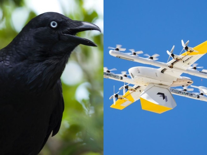 Is it a bird? Is it a plane? It’s a raven swooping on a drone attempting to make a delivery to a Canberran craving caffeine.