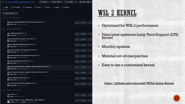 Allen Pais and Kelsey Steele both of Microsoft presented on the WSL2 kernel — both in the context of the traditional Windows Subsystem for Linux as well as Windows Subsystem for Android. In the presentation they covered the WSL/WSA architecture, how they track the Linux LTS kernel releases, and their upstream kernel contributions. Some of their upstream contributions are around continued testing of Linux kernel release candidates, improving testing of the kernel, and a goal of increasing their upstream contributions.